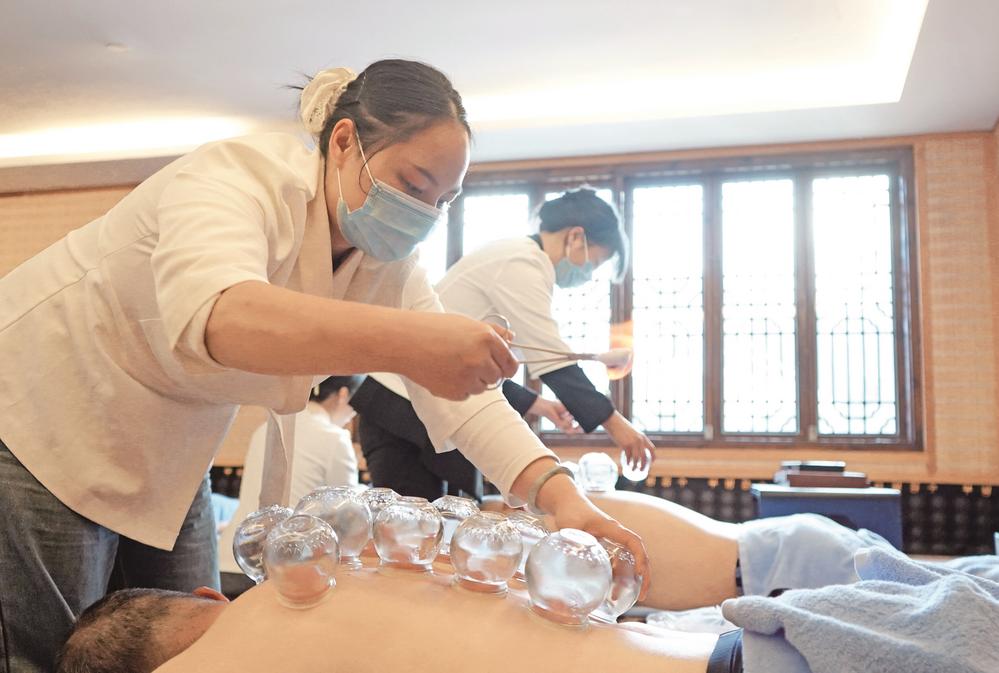 石阡佛顶山温泉小镇工作人员为游客理疗。胡雅诗 摄