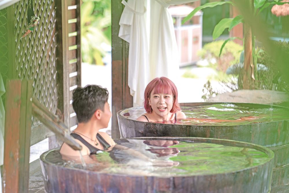 两名游客在石阡佛顶山温泉小镇泡温泉。 市融媒体中心记者 申逸恺 摄
