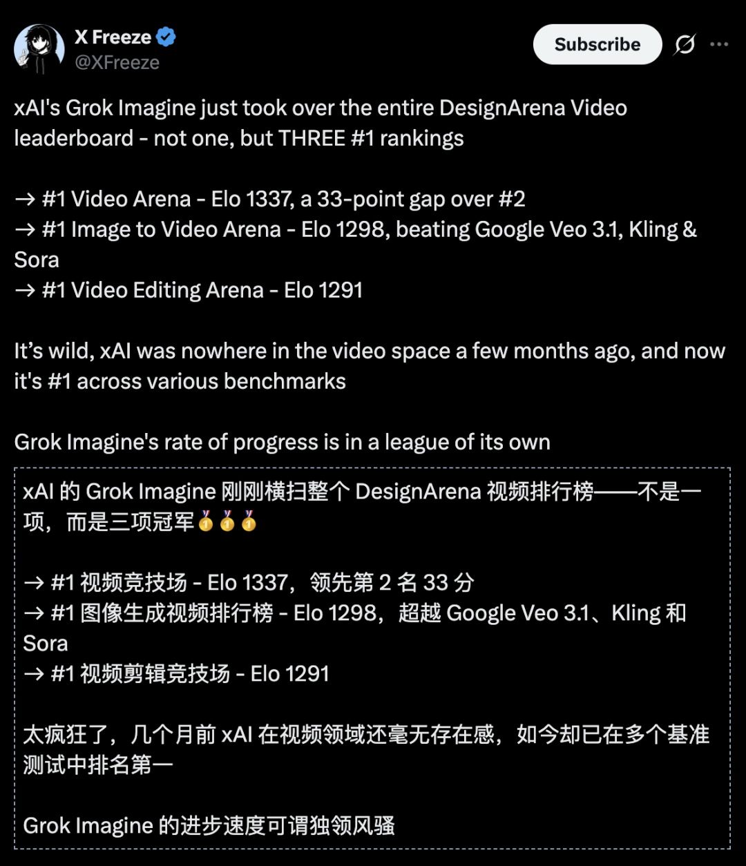 在DesignArena视频排行榜上, xAI的Grok Imagine强势夺魁,拿下视频竞技场(Elo分数1337)、图像转视频(Elo分数1298)和视频编辑(Elo分数1291)三项第一,远超谷歌Veo 3.1、Sora等对手。